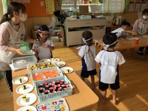 今日の開店に間に合わせるため、幼児組の子ども達が少しずつ準備をしてきたお寿司屋さん。タマゴ、サーモン、イクラと子ども達に人気のネタ3品を作りました。